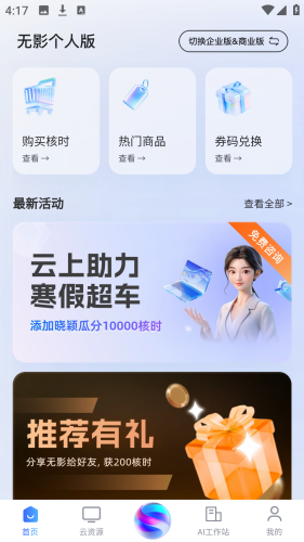 无影云电脑app官方是阿里巴巴官方打造的云端服务软件,软件采用非常先进的云端技术和大数据打造,让玩家可以在手机上就可以直接使用高性能的电脑,用户无论是用来商务办公还是玩游戏,都非常好用,而且所有的数据都在云端进行储存,不会占用过多的手机内存,让用户的生活更加的便捷,打开就可以直接使用。它能够精准匹配用户需求,灵活选择配置,助力企业实现成本效益最大化,无论身处何地,用户都能轻松访问,无缝衔接远程办公场景,还能够轻松体验各种3A大作,并且在体验过程中不会有任何卡顿,还有海量的福利活动免费送时长,有兴趣的小伙伴可以来下载体验。