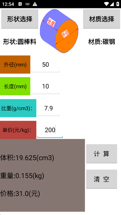 2、实时材料成本核算系统,支持棒料/管料/板料按密度自动计算重量与价格。