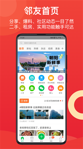 1、基于地理位置推荐邻居,支持查看周边用户动态并参与社区话题讨论。
