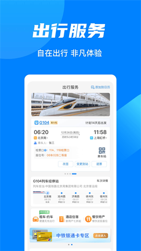 3、行程服务:出发提醒,退改签提醒,到站提醒,关注行程,不误车不误站。