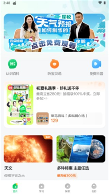 1、下载软件进入界面可以换看见很多的知识内容,有知识百科、听宝贝说、免费科普等等。