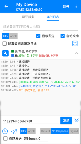 6、支持连接后树形结构列出所有服务和特征uuid以及特征的属性,可方便地对特征进行读写、notification开启和关闭、mtu设置等操作。