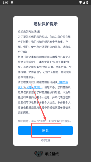 1、点击“同意”按钮以确认相关协议,顺利进入应用的主界面,准备进行后续操作。