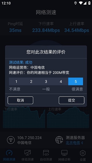 开始测试按钮下方是下行速率和上行速率的曲线图,可以直观看到测速过程中的速率变化。最底部则是会显示网络地址以及测速服务器。测速结束后,会弹出对此次结果评价的弹窗,并且给出相关评价,比如我测试的这个宽带的评价就是 " 网速相当于 100M 带宽 ",这可以给用户提供一个非常直观的参考。当然,对同一条宽带我也用华为推出的花瓣测速进行了比对,二者结果相差不大。