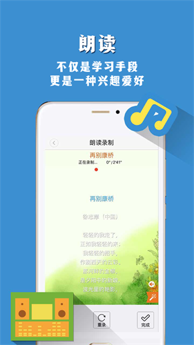 1、设置了多种丰富的功能图标,在朗读录制过程中提供了录音、重录以及完成录制快捷功能。