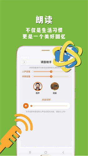 4、有调音助手,可以根据你的发音情况,调节人的声音和伴奏的声音。