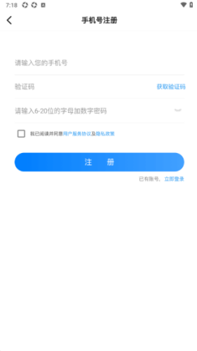 3、来到软件注册页面输入手机号、验证码、密码点击注册即可完成。