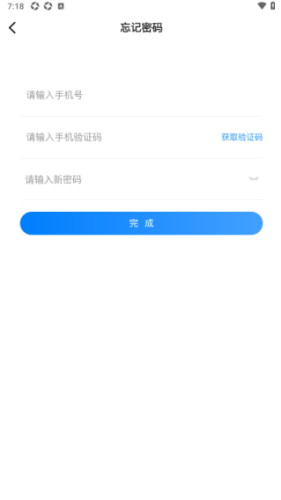 4、来到软件忘记密码页面,输入手机号、验证码、新密码点击完成即可。
