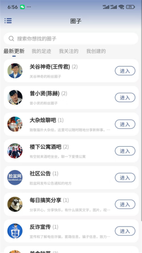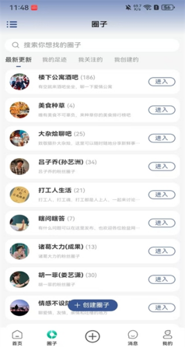 2、圈子:可以搜索你想找的圈子,也可以查看最近更新的圈子点击进入。