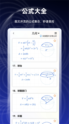 应用汇集了丰富的数学公式,支持图文并茂的展示,帮助用户快速查阅所需公式。