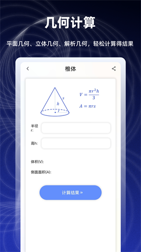 应用提供平面几何计算、立体几何计算、解析几何等功能,辅助数学和物理研究以及工程设计分析。