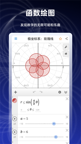 5、让函数不再冰冷,同学自学或老师课堂演示一键输入数学表达式/方程式,app将秒速生成直观的函数图像,深入理解函数概念。