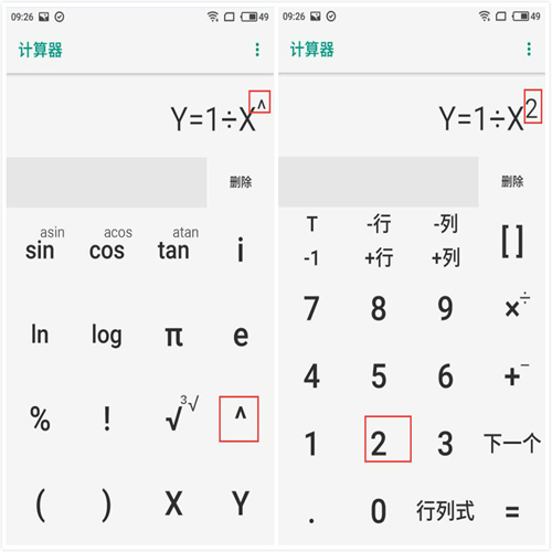 1、输入你的函数表达式,点击“ ^ ”+数字,可输入次方;