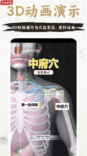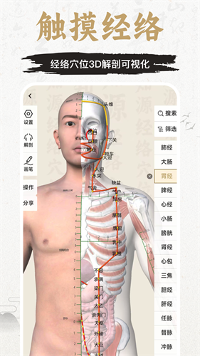 4、在3d人体解剖模型中精确展示中医的经络穴位与骨骼、肌肉和血管关系,并通过进针动画形象演示针灸操作过程,快速查询穴位提高学习效率。