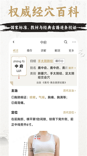 •经络穴位百科:覆盖十二经络、奇经八脉及经外奇穴,提供穴位定位、功效、主治及配穴方案,辅以解剖图和真人视频。