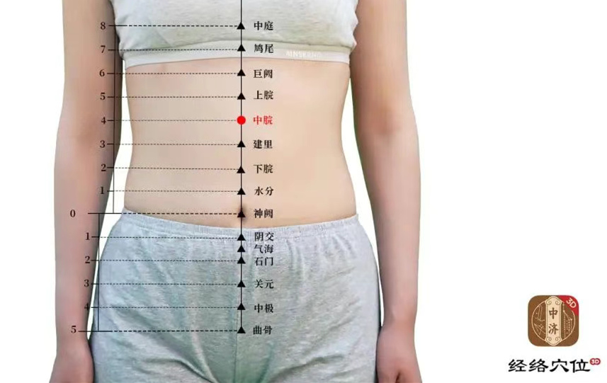 位于上腹部,脐中上4寸,约当胸骨下端和肚脐连接线中点处。该穴位具有健脾和胃、消食导滞的功效,能增强脾胃对水湿的运化能力。