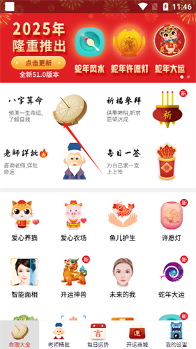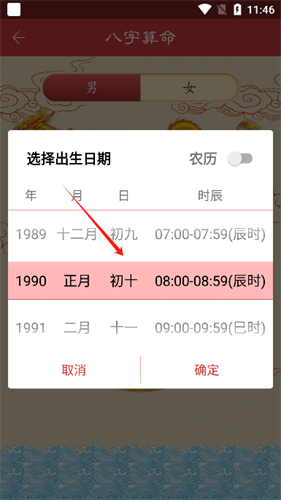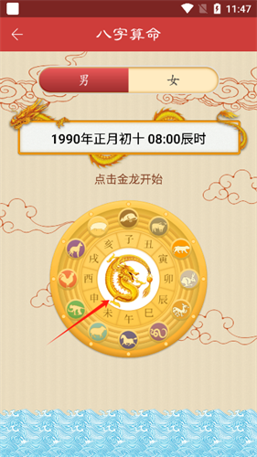 3、出生日期选择完成后点击最中间的金龙开始测算