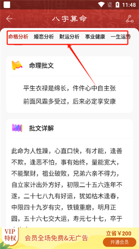 通过用户输入的出生年月日时,软件会进行详细的八字分析,包括家庭婚姻、学业事业等方面,为用户提供一生的命运解读。
