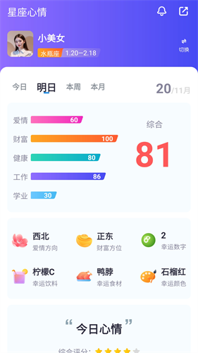 2、动态更新每日星座运势,结合生辰八字提供个性化爱情财富事业运势指引。
