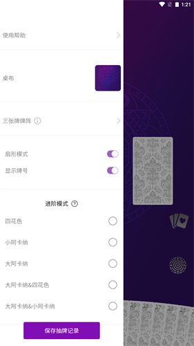 提供12种精美牌桌背景选择,可调整抽牌动画速度和特效,支持自定义牌背图案,打造专属占卜空间。