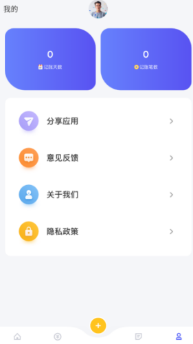 4、在“我的”模块,则能查看记账天数和记账笔数,随时进行意见反馈。