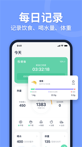 监督你按时断食、饮食和喝水,帮助你养成自律好习惯;目标完成情况提示,清晰了解每日的变化。