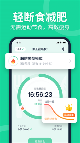 断食、体重、喝水、步数、腰围、饮食、运动等数据记录的功能,清楚的查看身体每天、每周和每月的变化;自动计算BMI和体脂率,帮助你选择最优的断食方式;支持与keep、乐刻、咕咚、美柚、华为运动、小米运动等应用的数据兼容。