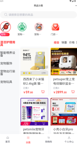 4、内置分类专栏,可以通过分类,查询和购买各种宠物日常所需的用品,价格相当划算。