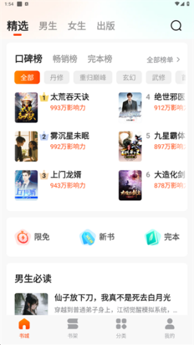 2、进入首页,上方可以选择精选推荐、男生、女生、出版等不同小说专区去选书。