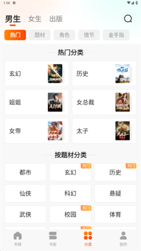 4、在分类中还有各种热门小说类型,也可以按照题材分类去选择你喜欢的小说阅读。