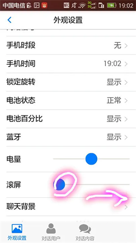 我们接下来点击外观设置就可以看到滚屏了,聊天内容超过一页才可以滑动哦,我们点击蓝点往右滑动。
