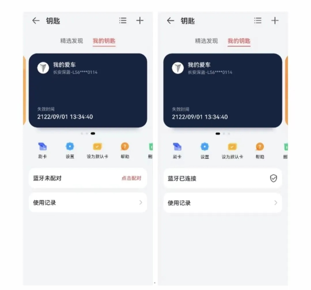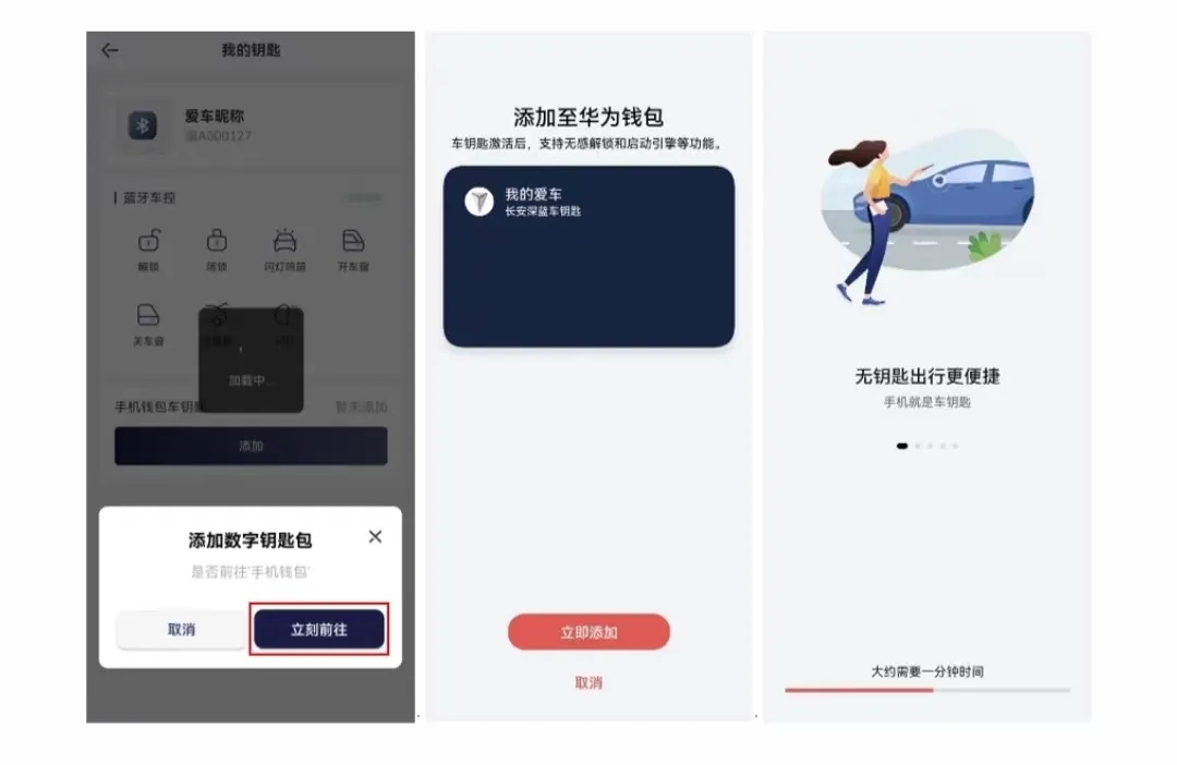手机安装并打开深蓝App,靠近车辆附近10米范围内,在服务中打开数字钥匙点击当前车辆,点击添加, App界面会弹出“添加数字钥匙包”,选择“立刻前往”后跳转至华为钱包,点击“立即添加”,等待一分钟左右后开通钱包钥匙,开卡成功后,手动配对蓝牙,待钱包页面显示“蓝牙已连接”即表示开卡已成功。