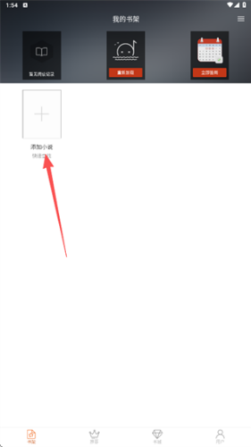 3、在我的书架页面上方可以查看你的阅读记录,点击添加小说就可以去书城选书了。