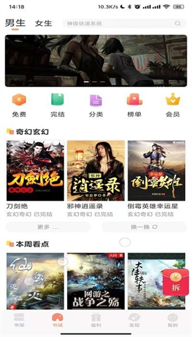 2、书城内提供男生和女生小说专区,提供免费、完结、小说分类、榜单等丰富选择。