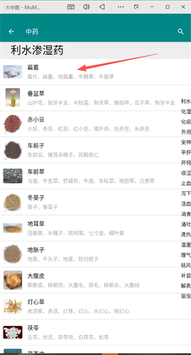 2、进入利水渗湿药列表页面,点击“篇蓄”条目,进入其详情页面。