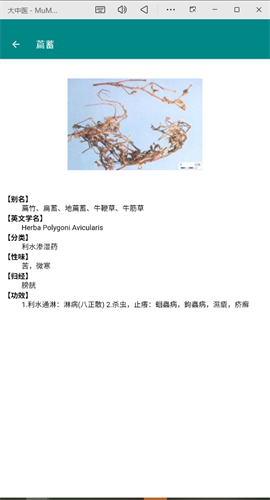 3、进入篇蓄详情页面,查看该中药的别名、性味、功效等信息。