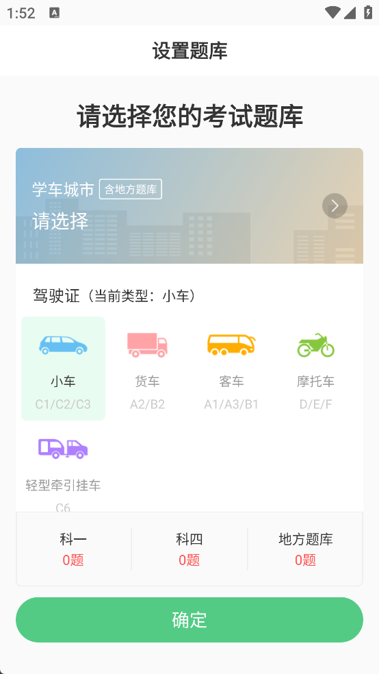 1、打开app,选择学车城市(含地方题库)、驾驶证类型(如小车C1)及对应科目。