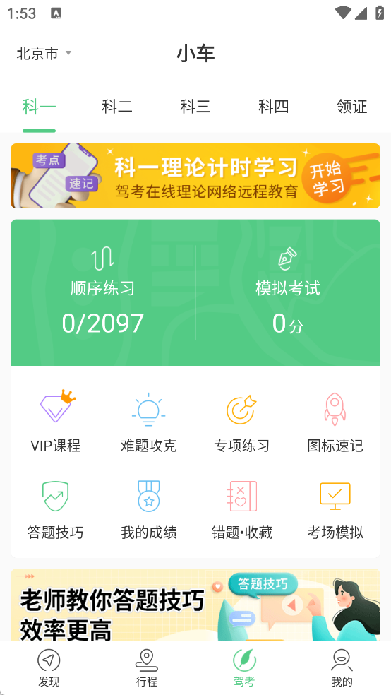 3、题库更新完成后,进入“发现”页,可使用计时课程、VIP课程等驾考学习功能。