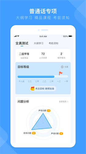 参照《国家普通话水平测试大纲》,题型覆盖单音节字词、多音节词语、朗读短文和命题说话。诊断结束后,系统会生成水平测试报告,用户通过查看报告了解自身的普通话水平等级及存在语音问题。