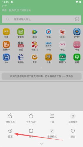 2、这里提供了全屏模式、无痕模式等功能,我们找到并点击设置,如图所示。