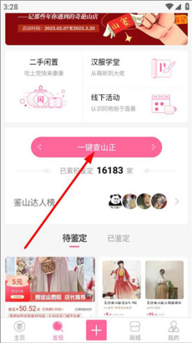 3、在发现页面找到待鉴定或已鉴定的山正店铺入口,点击进入。