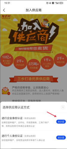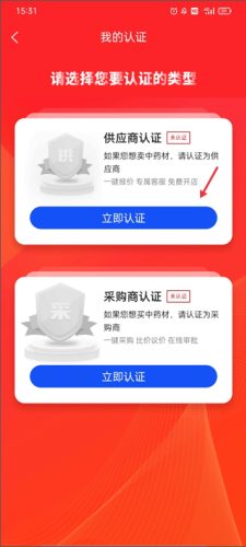 2、页面将显示两种认证类型选项,请选择点击供应商认证按钮。