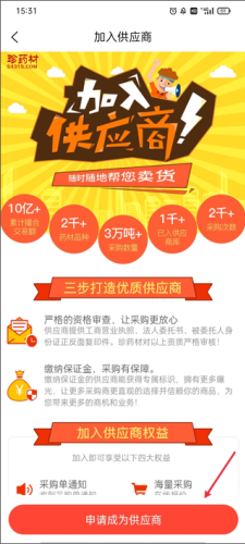 3、查看加入供应商的具体权益与要求说明,点击申请成为供应商。