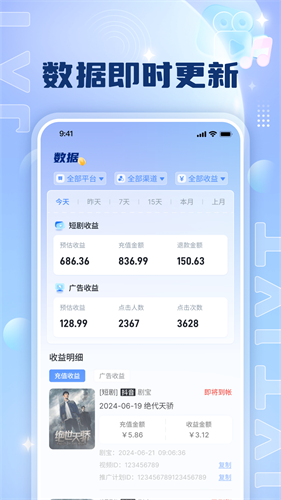 3、数据看板:汇总各平台播放量、互动率与粉丝增长等关键指标,以可视化图表呈现,辅助运营决策。