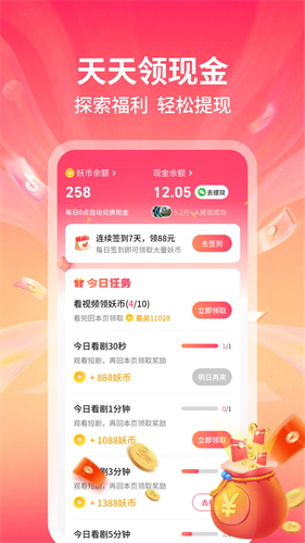 观看短剧即可获得妖币,看得越多赚得越多,轻松实现边看剧边赚钱。