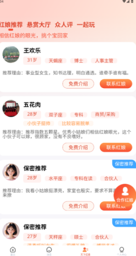 3、内置红娘推荐板块,能够联系专业红娘,为大家推荐合拍的伴侣,每一次都是有效社交。