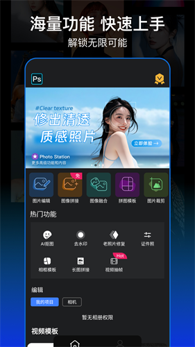PS图片处理手机版是一款拥有专业级图像处理能力的全能修图神器,它不只是滤镜堆砌,而是真正复刻了Photoshop核心逻辑的移动工作站,从发丝级AI抠图、智能去水印,到老照片上色修复、视频抽帧取图,再到精细调色面板支持高光阴影、色彩平衡、色调分离等进阶参数,每一项功能都直击创作者痛点,用户可一键更换人像背景、拼接长图做海报,也能用漫画风或胶片滤镜赋予照片独特艺术感。PS图片处理手机版没有冗余功能干扰,所有工具围绕“快、准、美”展开,通勤路上修完图,下车就能发,而且操作门槛极低,滑动调节、智能推荐、自动优化让新手也能快速出片,而专业模式又为高手留足创作空间。对普通用户而言,它不教摄影,只帮你把随手拍变成值得晒的好图。