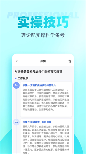 2、三维实操技能教学模块,幼儿急救、卫生消毒等场景化视频演示直观易懂。