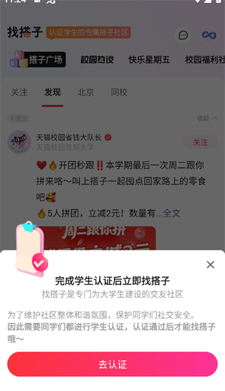 3、如果尚未完成学生认证,系统会提示【完成学生认证后立即找搭子】,点击【去认证】完成身份验证。认证通过后,按照页面指引填写闲置物品信息并上传图片,即可发布闲置物品。