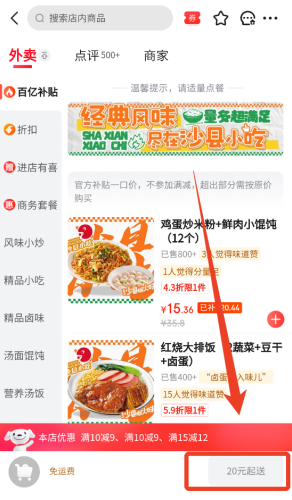 2、进去之后就能开始挑选你想吃的美食了,每家店的起送价格都不同,可以看右下角显示。